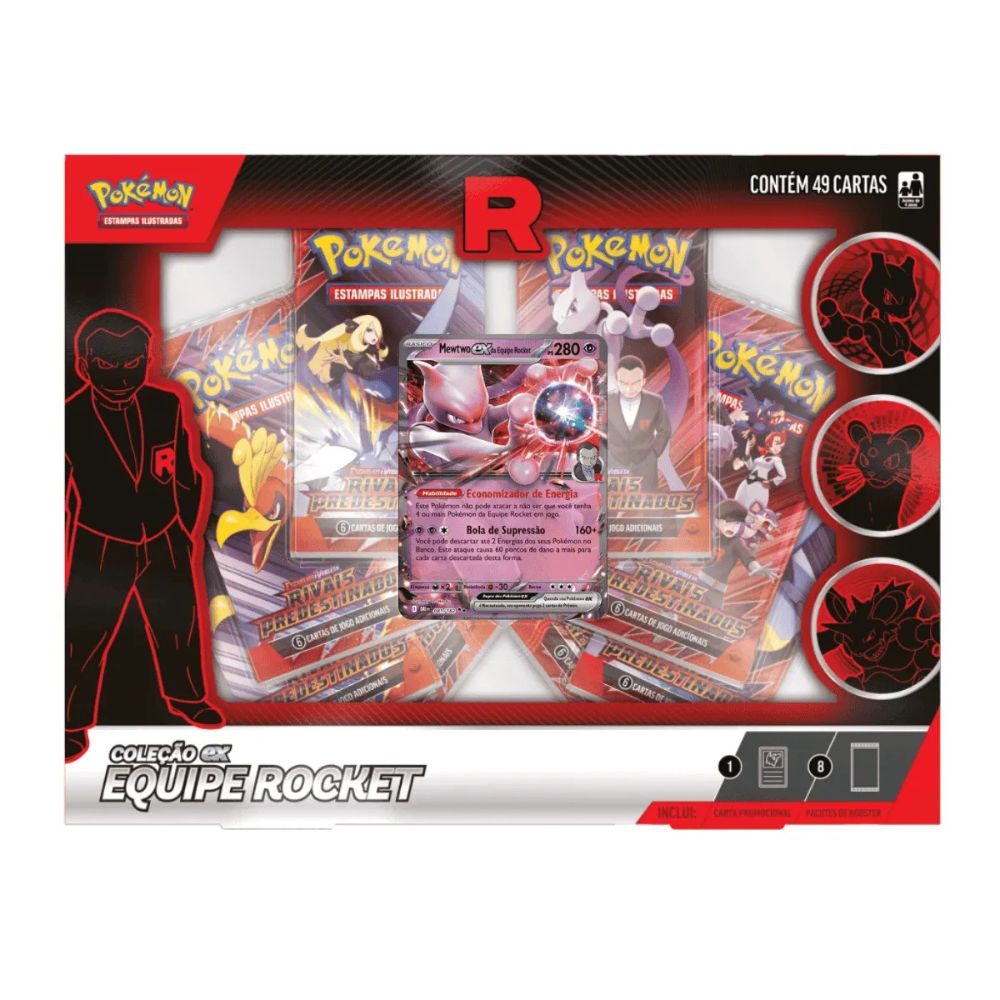 A Box EX Equipe Rocket – Mewtwo EX é um dos produtos mais impactantes do Pokémon Estampas Ilustradas, unindo o poder lendário de Mewtwo ao visual icônico da Equipe Rocket.